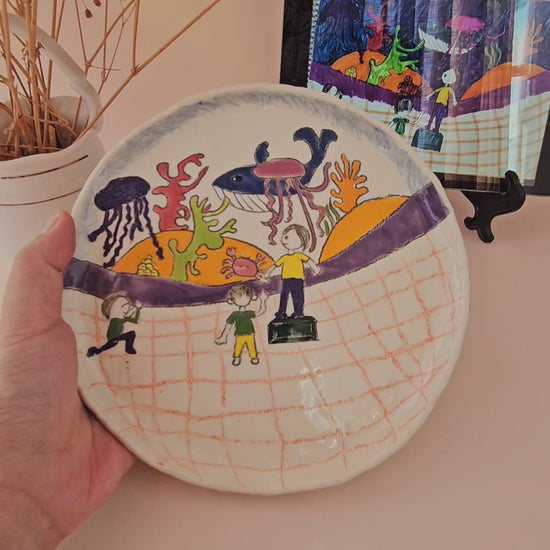 A custom ceramic plate created from your child’s artwork — carefully translated and hand-painted onto clay by real artists.