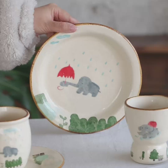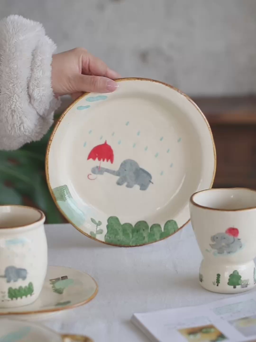 This hand-painted ceramic collection features a gentle elephant walking through the rain, holding a bright red umbrella as soft raindrops fall from the sky. The illustration wraps across each piece, bringing a small story to the table — calm, whimsical, and full of childhood imagination.