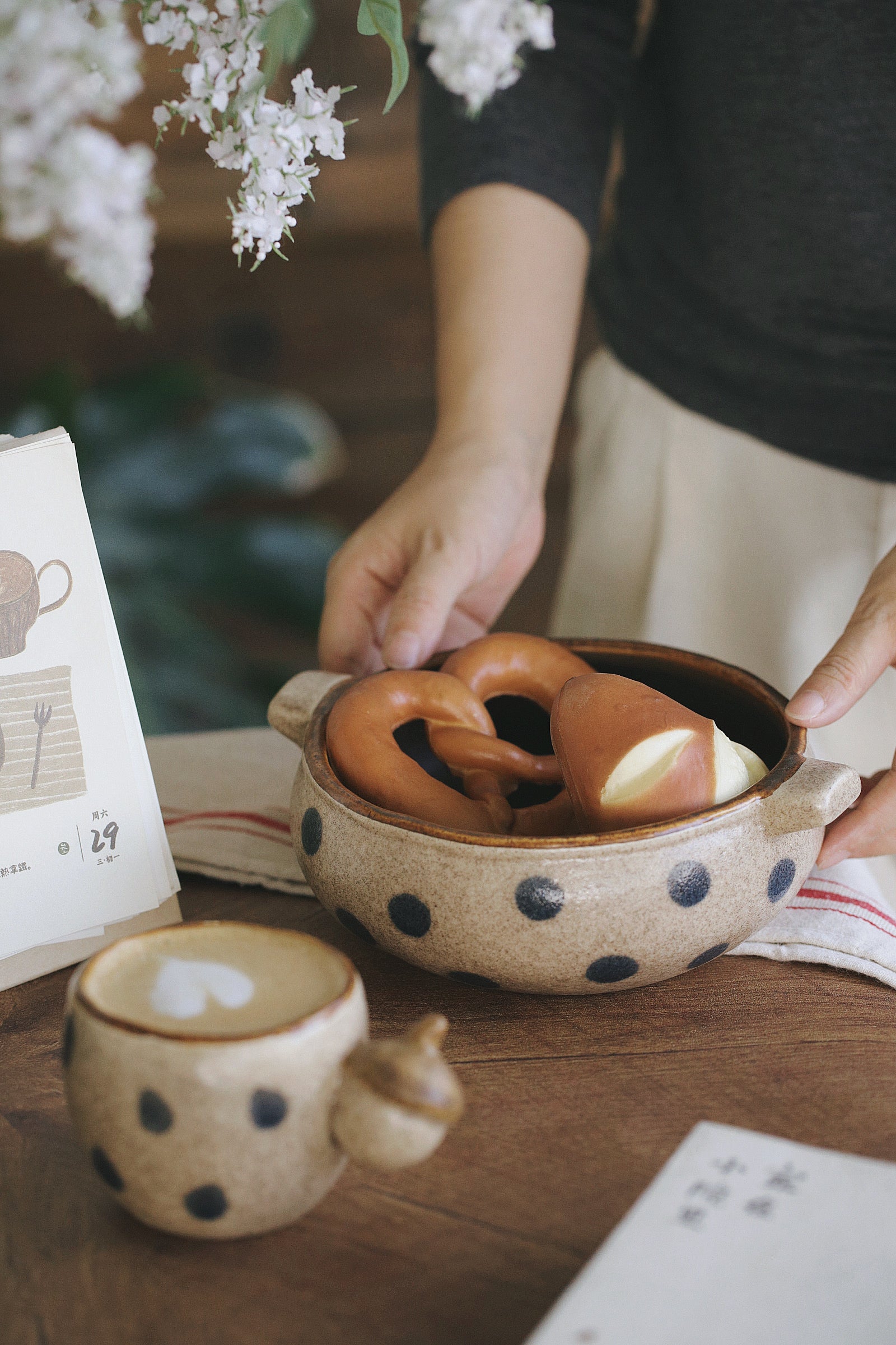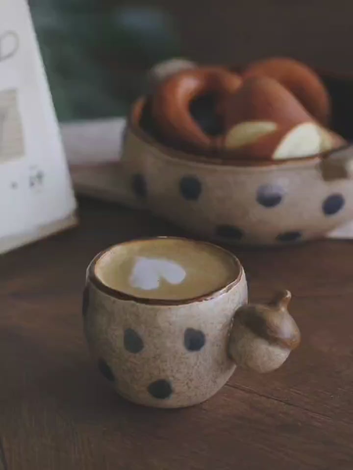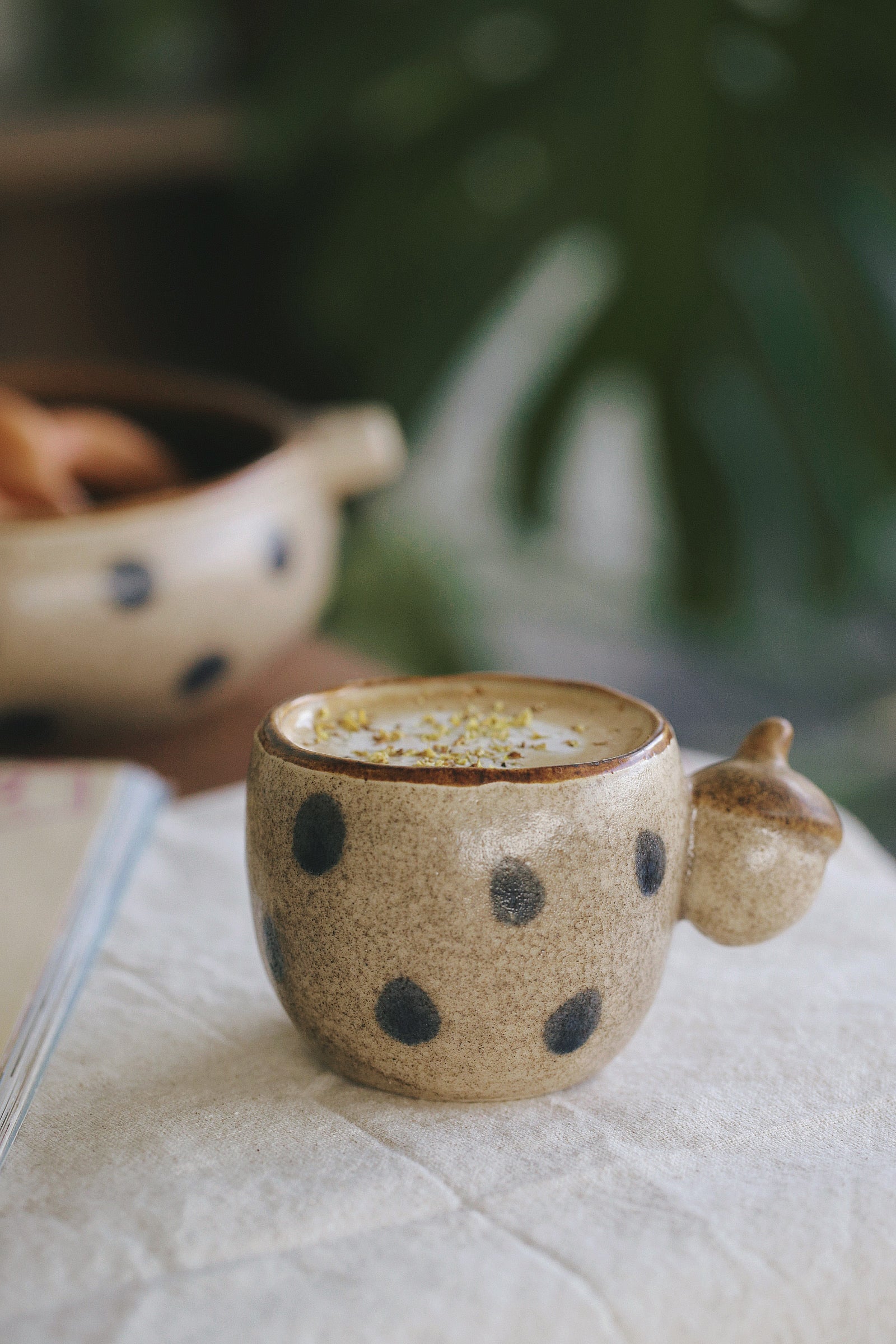 Bring a touch of woodland-inspired whimsy to your coffee ritual with the Ink Spot Acorn Cup. Part of The Gallery Series, this piece is defined by its unique "acorn" handle—a small, sculptural detail designed for a delicate pinch-grip. Like the rest of the Ink Spot collection, this cup features our signature hand-painted indigo spots, ensuring every piece has its own "wabi-sabi" soul.
